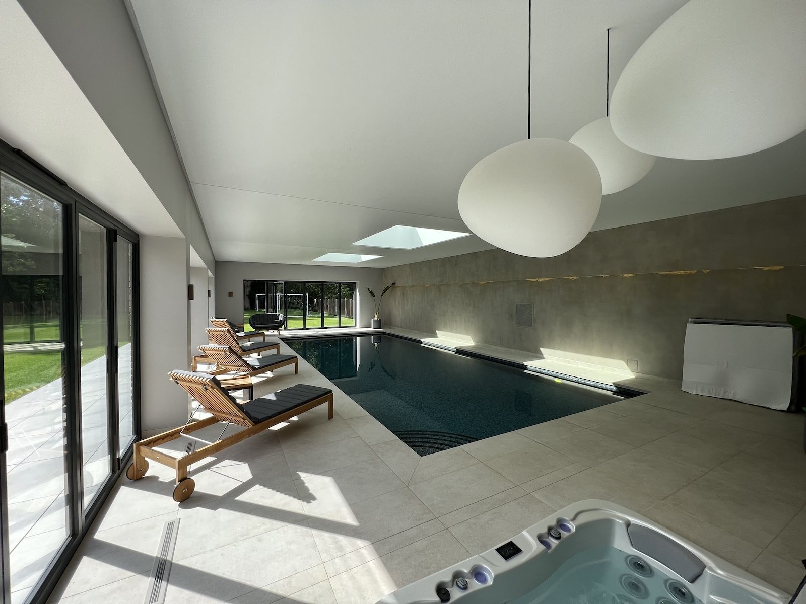 Lots of natural light and extensive glazing sets off this wonderful new indoor pool. Roof Lights and a Bespoke Designer Wall.