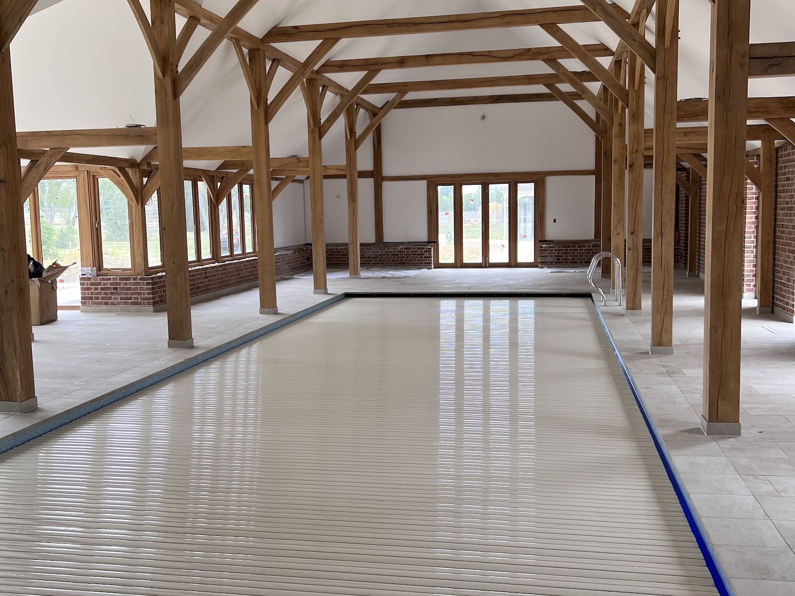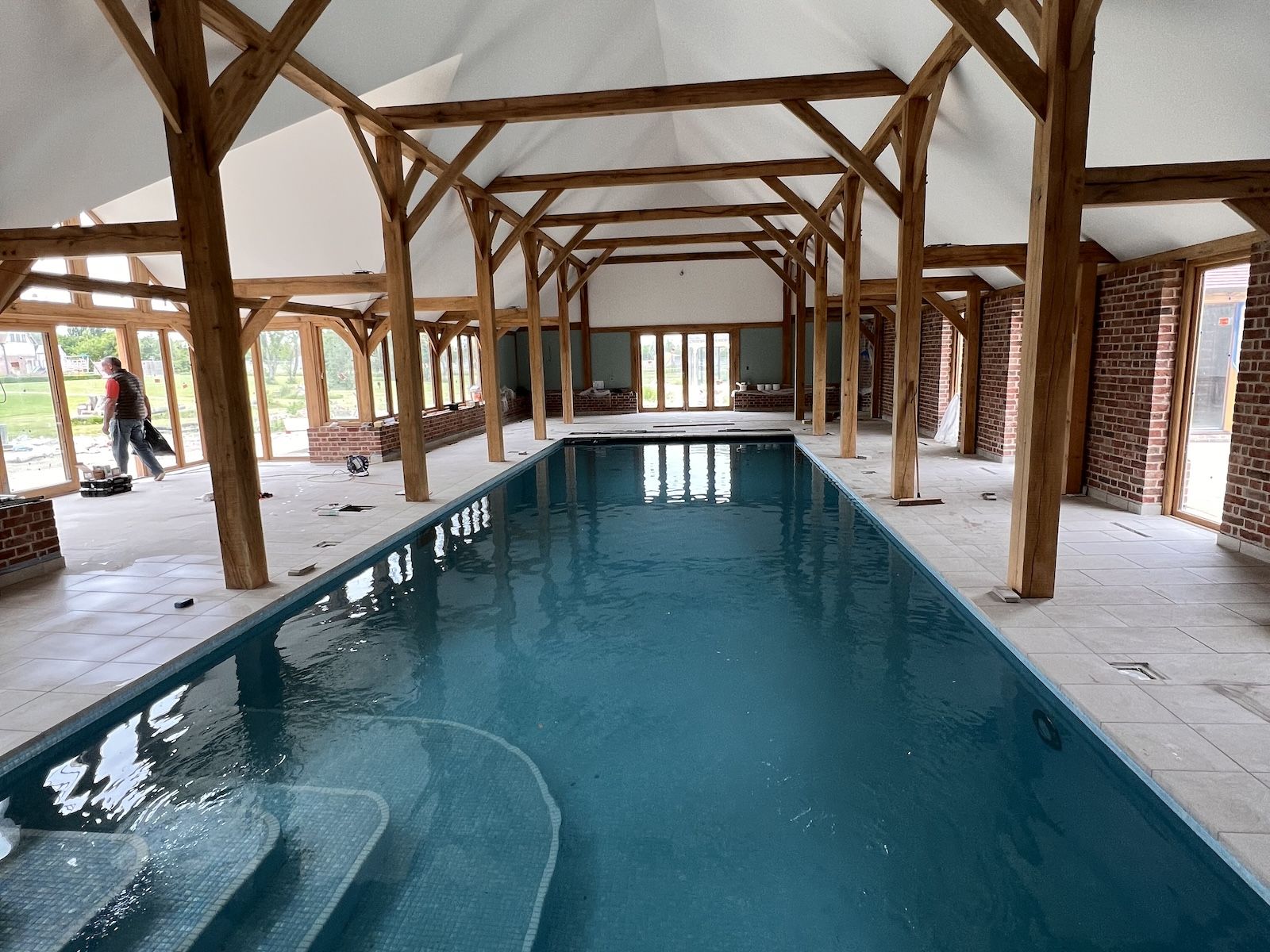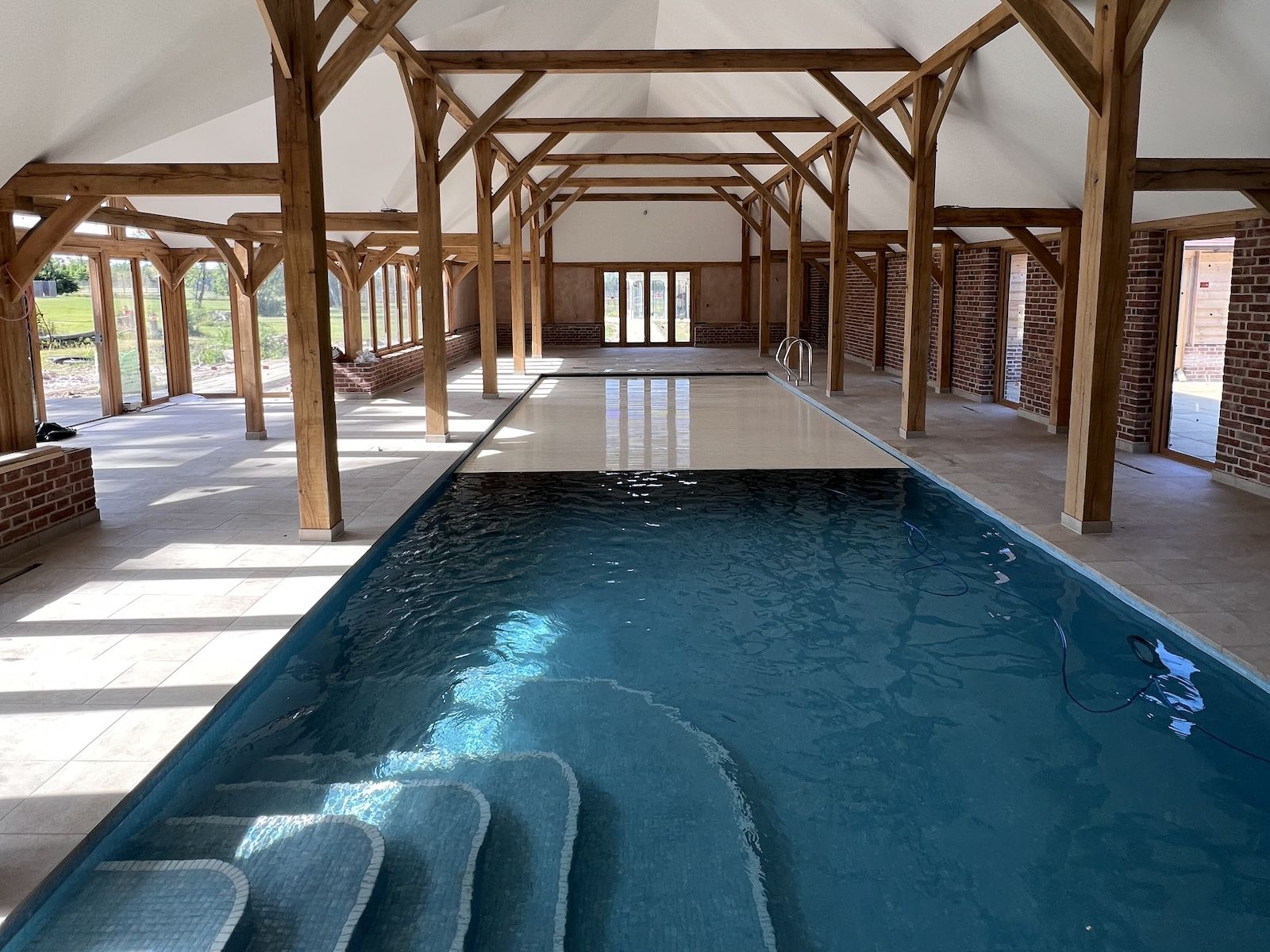 Design Brief: Large Family pool with safe area for younger family members. Exercise for older family members. In keeping with stunning Oak Pool Hall.